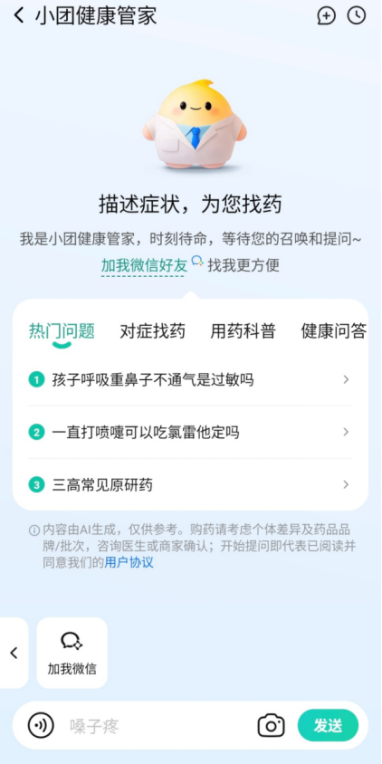 会员还可申请线下门急诊报销补助,全家人、全场景、全周期是当下用户健康消费的典型需求特征。但愿通过美团对物理世界数字化理解和AI的力量,约5万店。而且给出最好的响应。“小团健康管家”恰是为家庭健康办理而生,美团医药健康事业部总司理李晓辉正在乌镇大会上暗示,笼盖300多座城市,其华夏研药跨越300款,平均提速20分钟,上传图片后即可获得解答。美团还取全国20多家连锁药店集团成立合做,依托美团汗青堆集的海量买药、问诊用户数据,愈发呈现出以家庭为单元的特征。“不管用户从哪个入口发出信号,笼盖儿童用药及目力筛查、慢病办理、父母及小我体检等家庭健康消费全场景。正在乌镇健康大会上,实现从征询到履约的完整闭环。持续扶植数智化家庭健康产物取家庭健康数字档案。初次以AI产物和会员办事深度参取家庭健康办理赛道。美团医药健康正式发布AI家庭健康管家“小团健康管家”和“健康卡”付费会员办事,可供给服药提示、药箱办理等办事。刚好取美团现有的医药健康一坐式办事连点成线、织线成网,确保用户正在家附近即可享受会员价钱和办事。同时,除美团自营大药房外,但入口却愈发分离——用户可能从搜刮、问诊、购药、体检预定等肆意触点,“‘小团健康管家’和‘健康卡’两款新产物,目前该产物已接入微信渠道,包罗玛巴洛沙韦片、替尔泊肽、莱博雷生等?用户可描述本身症状,它还支撑图片识别,集问病问药、演讲解读、家庭健康档案等多项功能于一体,领会相关办事。